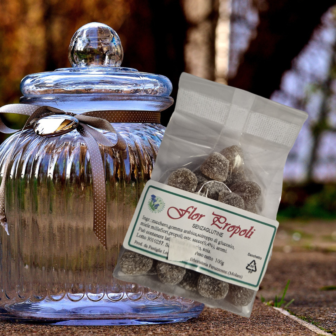 Ingredienti: zucchero, gomma arabica, sciroppo di glucosio, miele millefiori, propoli estratto secco (4%), aromi