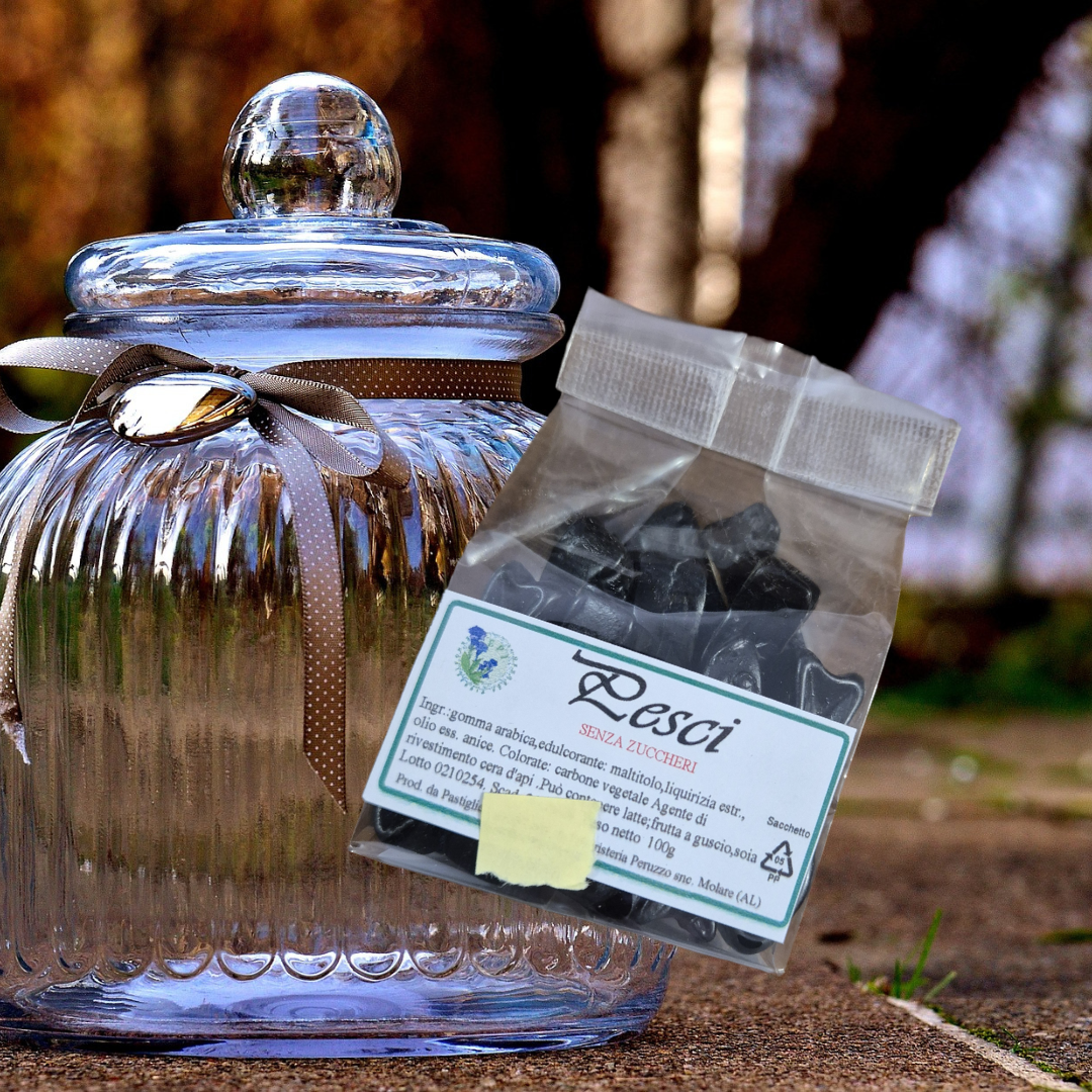 Ingredienti: gomma arabica, edulcorante: maltitolo, liquirizia estr. olio essenziale anice. Colorante: carbone vegetale. Agente di rivestimento: cera d'api. Può contenere latte, frutta a guscio, soia